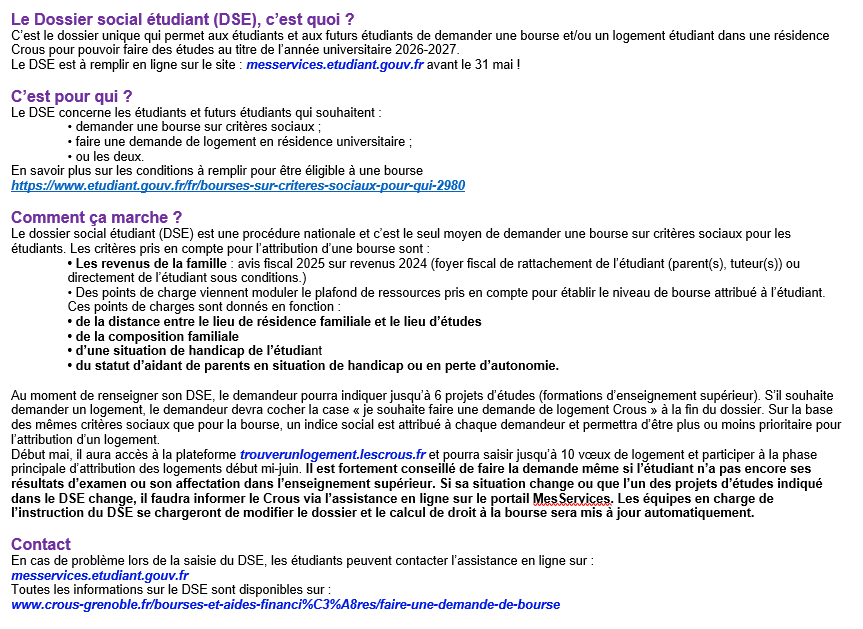 DSE, dossier social étudiant - simulateur de bourse, demande de bourse , demande de logement : https://messervices.etudiant.gouv.fr/